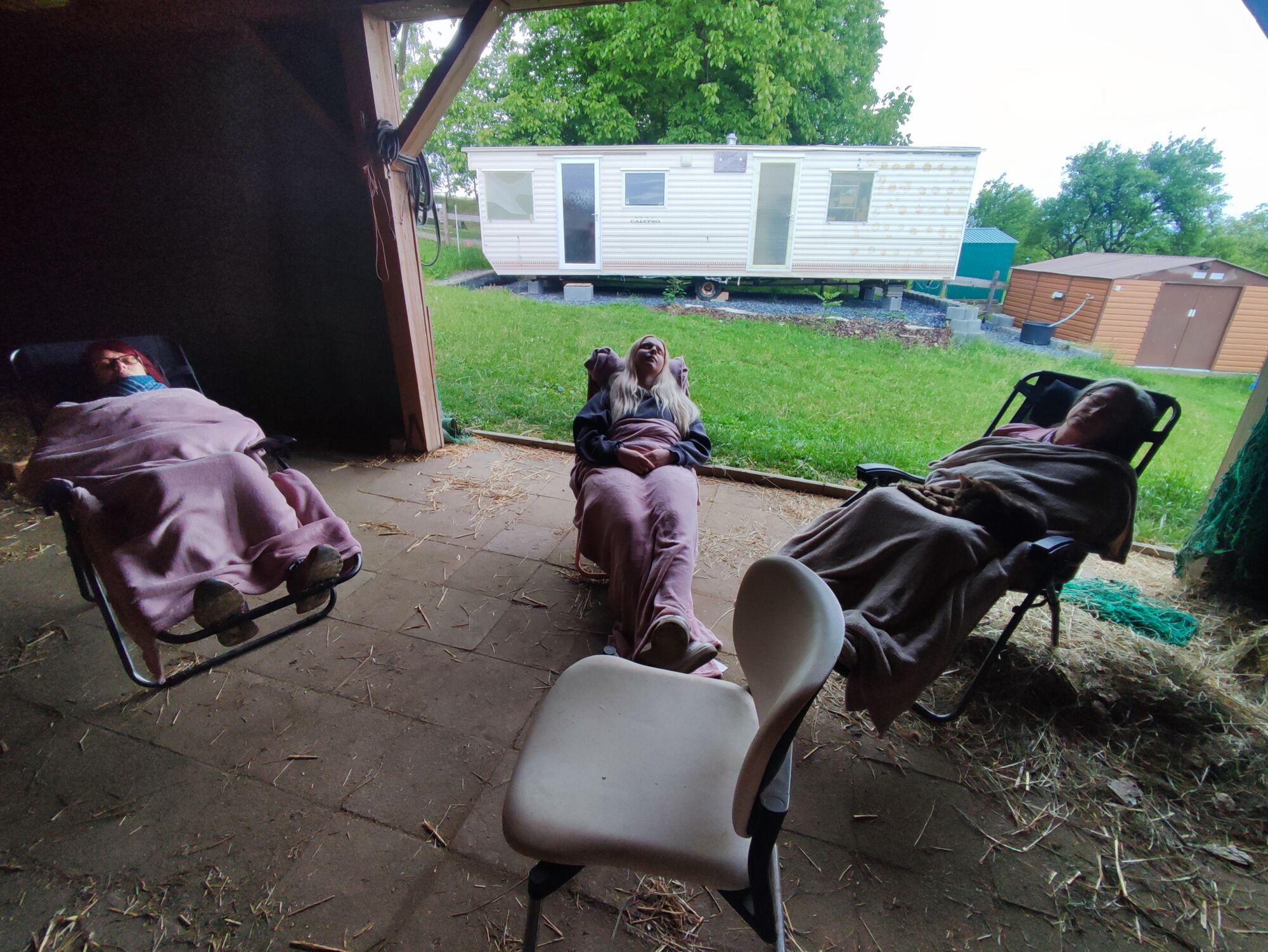 Meditace probíhá na louce uprostřed koňského výběhu.